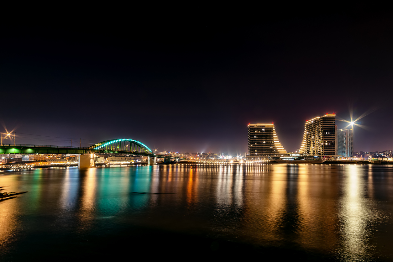 Belgrade, Serbia – February 10, 2019: Belgrade waterfront and Old bridge on the Sava River. Panorama of Belgrade by night with reflection.