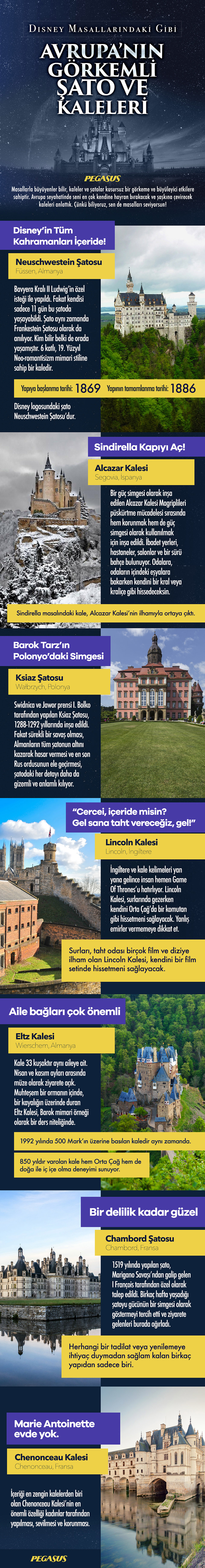 Disney prenseslerinin eteklerinin süpürdüğü merdivenlerden, şövalyelerin düşmanlarını savurduğu nehir üzeri kapılarından, binlerce taşla örülü, masal kahramanlarının ve kraliyet ailelerinin portrelerinin asılı olduğu duvarların yanından yürümek ister misin? O zaman şimdi ucuz uçak biletini infografikte anlattığımız yerlerden birine alıyorsun ve yola koyuluyorsun!