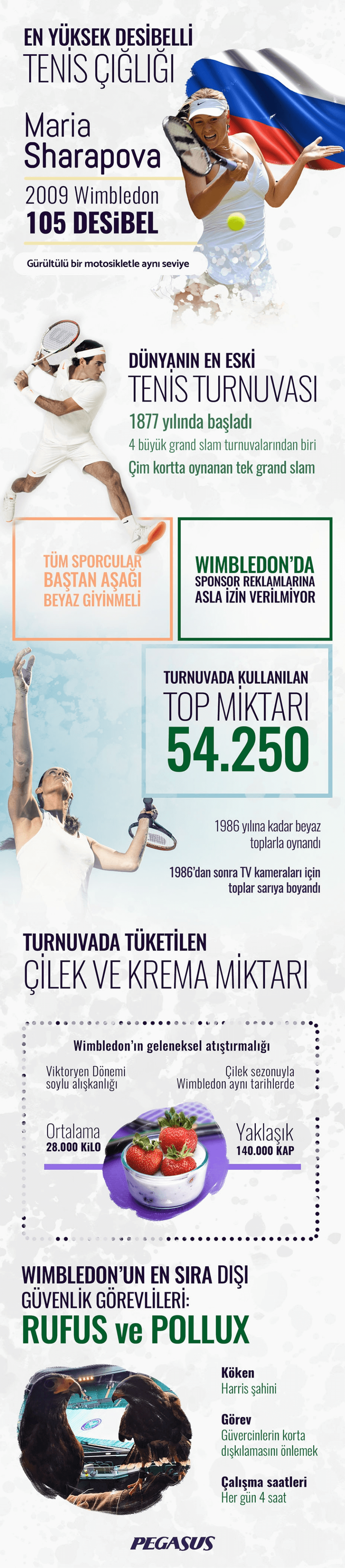 Wimbledon’da kortların temizliği ve düzeni için kullanılan sıra dışı güvenlik görevlileri, Harris şahinleri Rufus ve Pollux. Bu iki Harris şahini, her gün 4 saat boyunca kortlarda devriye gezerek güvercinlerin korta dışkılamasını önlemekle görevli. Kuş Denetim Sistemleri (Avian Control System) şirketinin çalışanları olan Rufus ve Pollux, bu görevleriyle Wimbledon’ın temiz ve düzenli kalmasına katkıda bulunuyorlar.