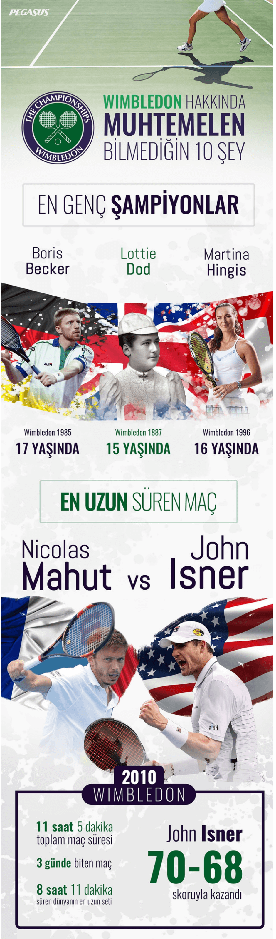 Wimbledon Tenis Turnuvası tarihindeki en uzun süren maç, 2010 yılında Nicolas Mahut ve John Isner arasında oynanmıştı. Bu efsanevi maç, toplamda 11 saat 5 dakika sürerek toplamda üç güne yayılmıştı. Maçın son seti ise 8 saat 11 dakika sürünce bu set, tenis tarihinin en uzun seti olarak kayıtlara geçmişti. Maçın kazananı ise 70-68’lik skorla John Isner olmuştu. Bu karşılaşma hâlâ Wimbledon tarihinin en unutulmaz anlarından biri olarak anılıyor.