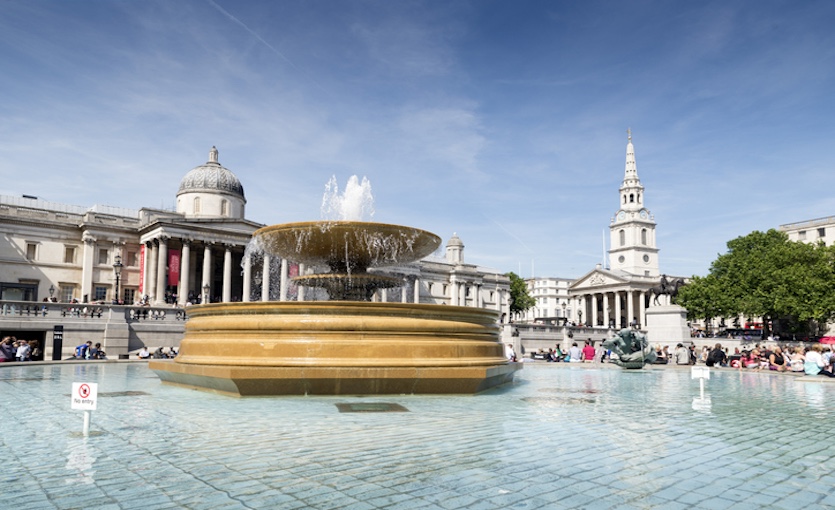Looking across one of the fountains in Trafalgar Square towards the National Gallery