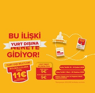 Kampanya Teklifi: 13-14 Şubat 2025 tarihlerinde alacağın, 1 Mart-30 Haziran 2025 uçuş tarihli belirtilen yurt dışı hatlarındaki Light Paket biletleri Pegasus BolBollulara 11€+vergilerden başlayan fiyatlarla satışta! Üstelik 13-14 Şubat 2025 tarihlerinde Light Paket alan yolcular için özel olarak ek kabin bagajı hakkı 9 Euro ve 12 kg’lık uçak altı bagajı hakkı 9 Euro! Ayrıca, Light paket bilet fiyatı üzerine 19€ ek fark ödemesi ile Süper Eko paket seçimi yapmak mümkün! Hadi hemen flypgs.com ve Pegasus Mobil uygulamasına gel, biletlerini al, sadece 200.000 adet koltukla geçerli bu fırsatı kaçırma!